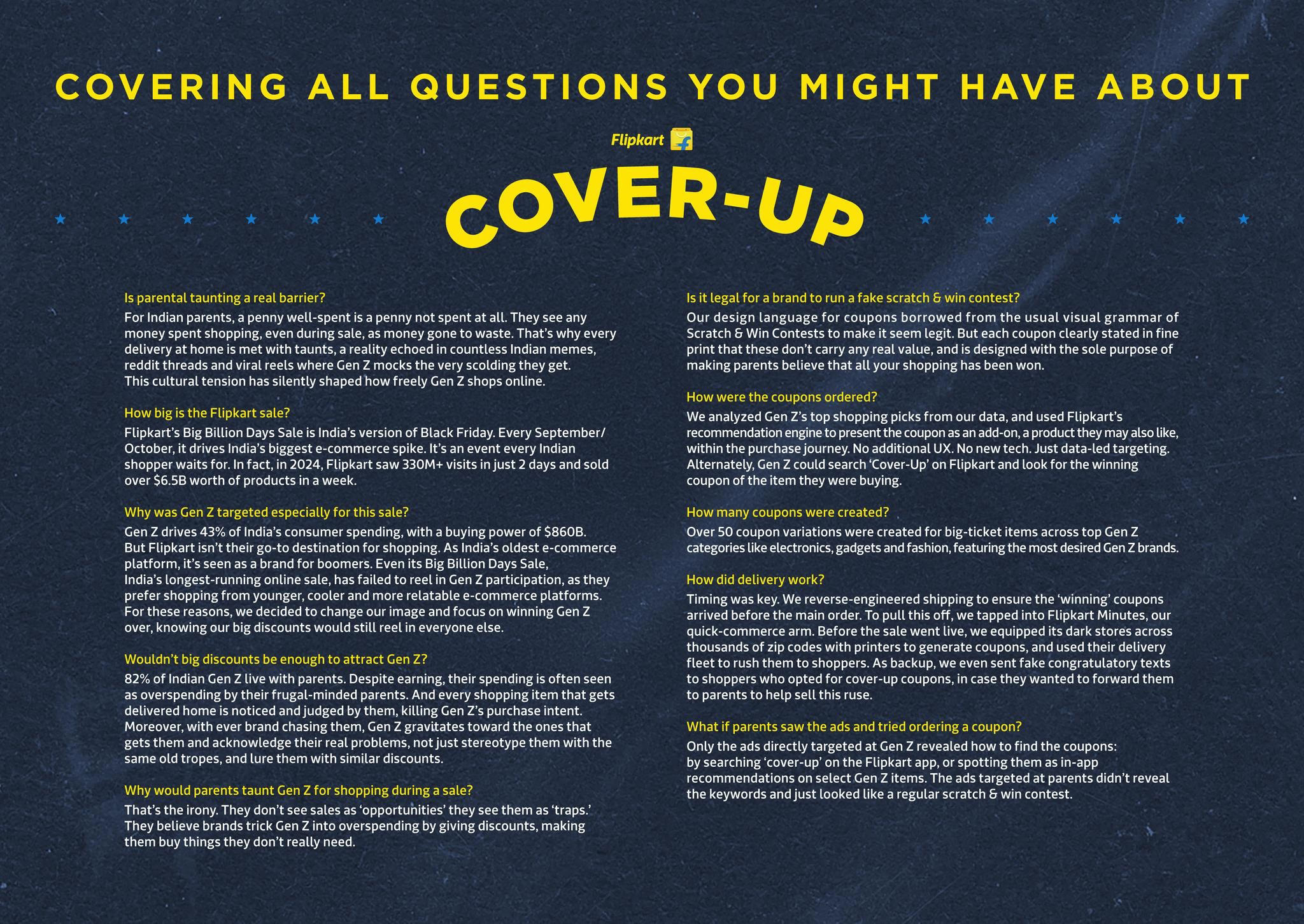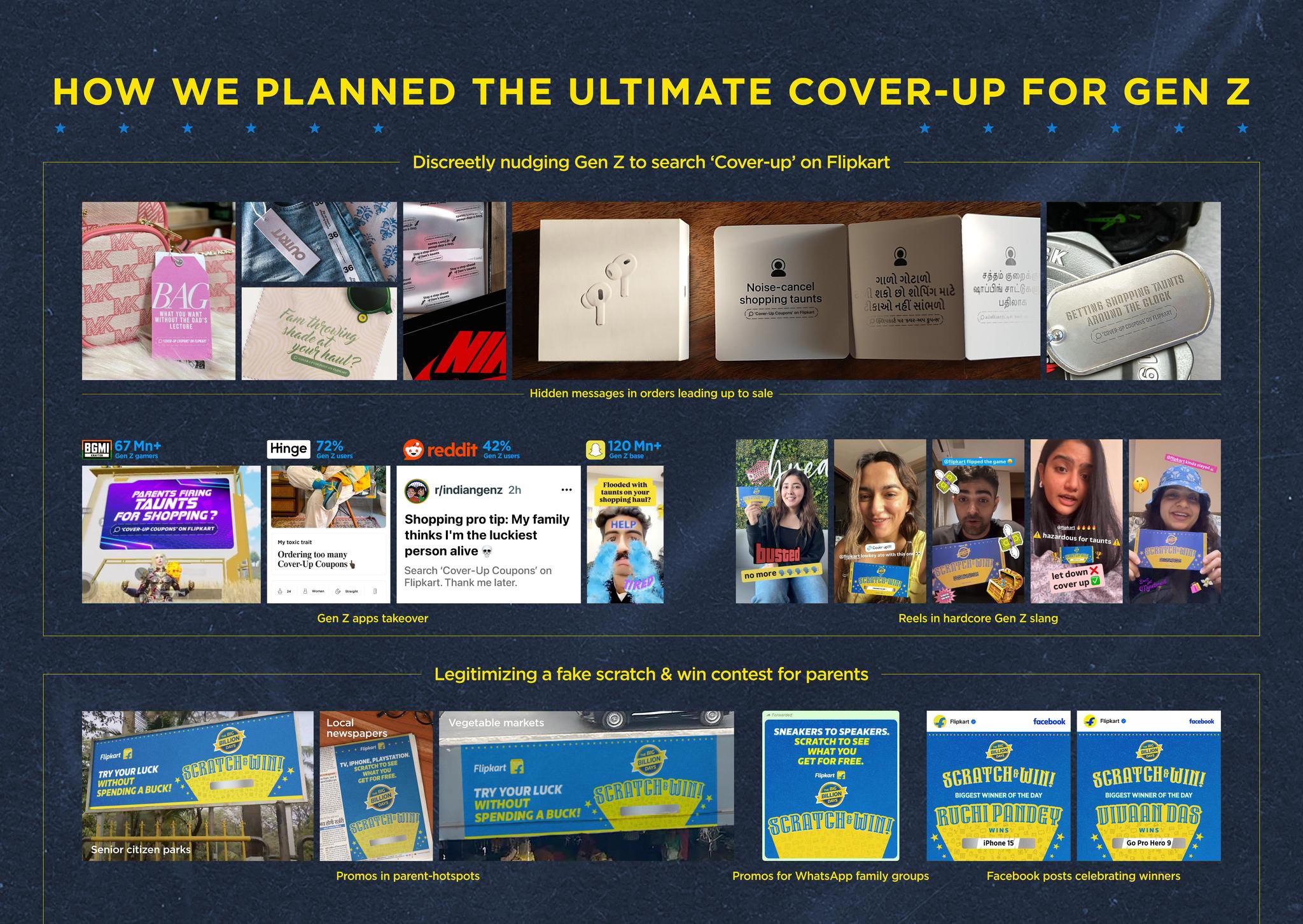 Instead of just creating a big Gen Z sale, Flipkart tackled the real barrier: Parental taunts. And created Cover-up Coupons. Fake scratch & win vouchers for every Gen Z item on sale. Gen Z could order it via Flipkart’s app while shopping, and get it delivered before the actual item. Making Gen Z's shopping look like winning in the eyes of frugal-minded Indian parents. We executed the campaign in two parallel streams. To keep the cover-up hWe spoke to Gen Z discreetly. Through hidden messages in Gen Z orders leading up to the sale. Reels were crafted in Gen Z slang. And took over Gen Z hangouts like Snapchat (120 Mn Gen Z base), BGMI (67 Mn Gen Z gamers), Reddit (42% Gen Z), and dating apps like Hinge (72% Gen Z users). For parents, we built legitimacy. Fake scratch & win promos ran in banks, vegetable markets, parks, and regional newspapers. Declared biggest winners of the day on Facebook (home to 140 Mn+ people born before 1980). Flipkart even seeded WhatsApp-friendly promos, using Gen Z to sneak into family groups. All to make Gen Z’s shopping look like real wins in front of parents.