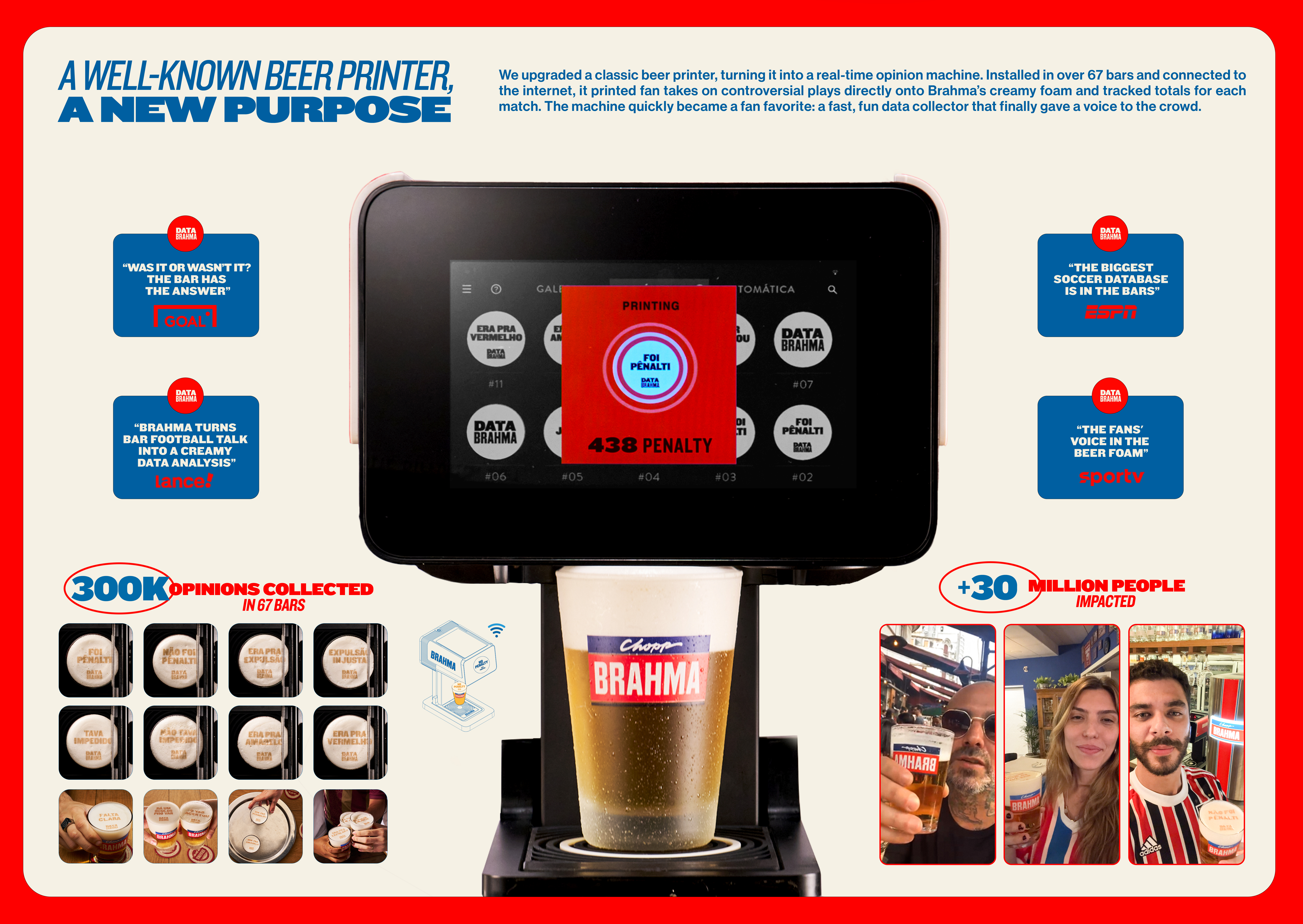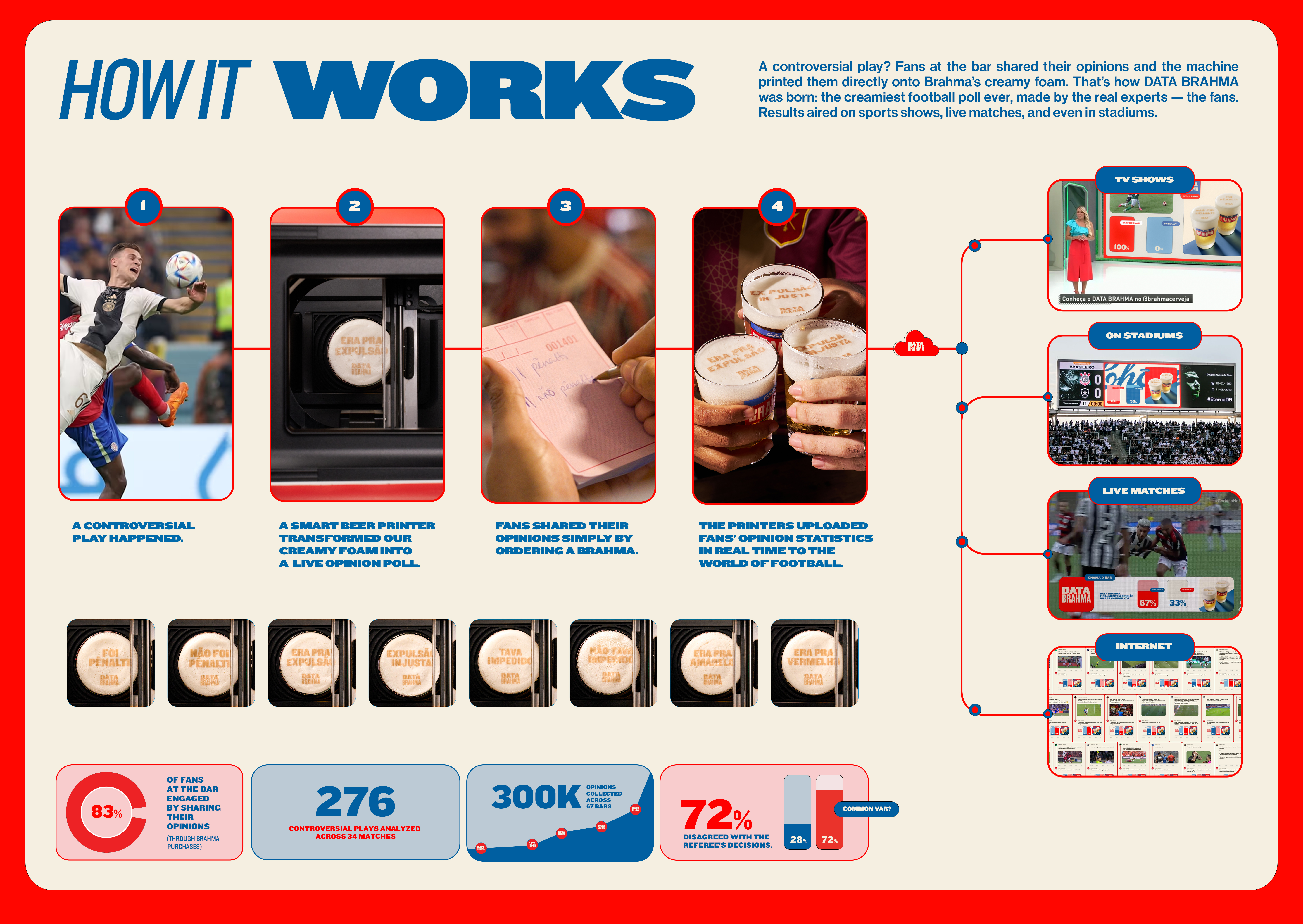 Brahma answered with Data Brahma, the first opinion poll captured live through beer foam. The brand installed hundreds of smart printers in 67 key bars across Brazil, turning each Brahma pour into a tool for capturing fan sentiment. When controversial moments happened, fans responded instantly, and their opinions were logged in real time. This transformed casual bar talk into authentic football data, which was then broadcast across TV shows, live matches, stadium screens, and digital platforms. The campaign blended physical experience, technology, and media, turning a simple ritual into a national conversation. It was precisely targeted, culturally embedded, and adaptable to live game dynamics. The results were powerful—over 300,000 opinions captured, 30 million people reached, and a 53 percent sales increase on activation days. By placing fans at the center and using bars as the main stage for debate, Brahma created a direct, emotional, and unforgettable brand experience.