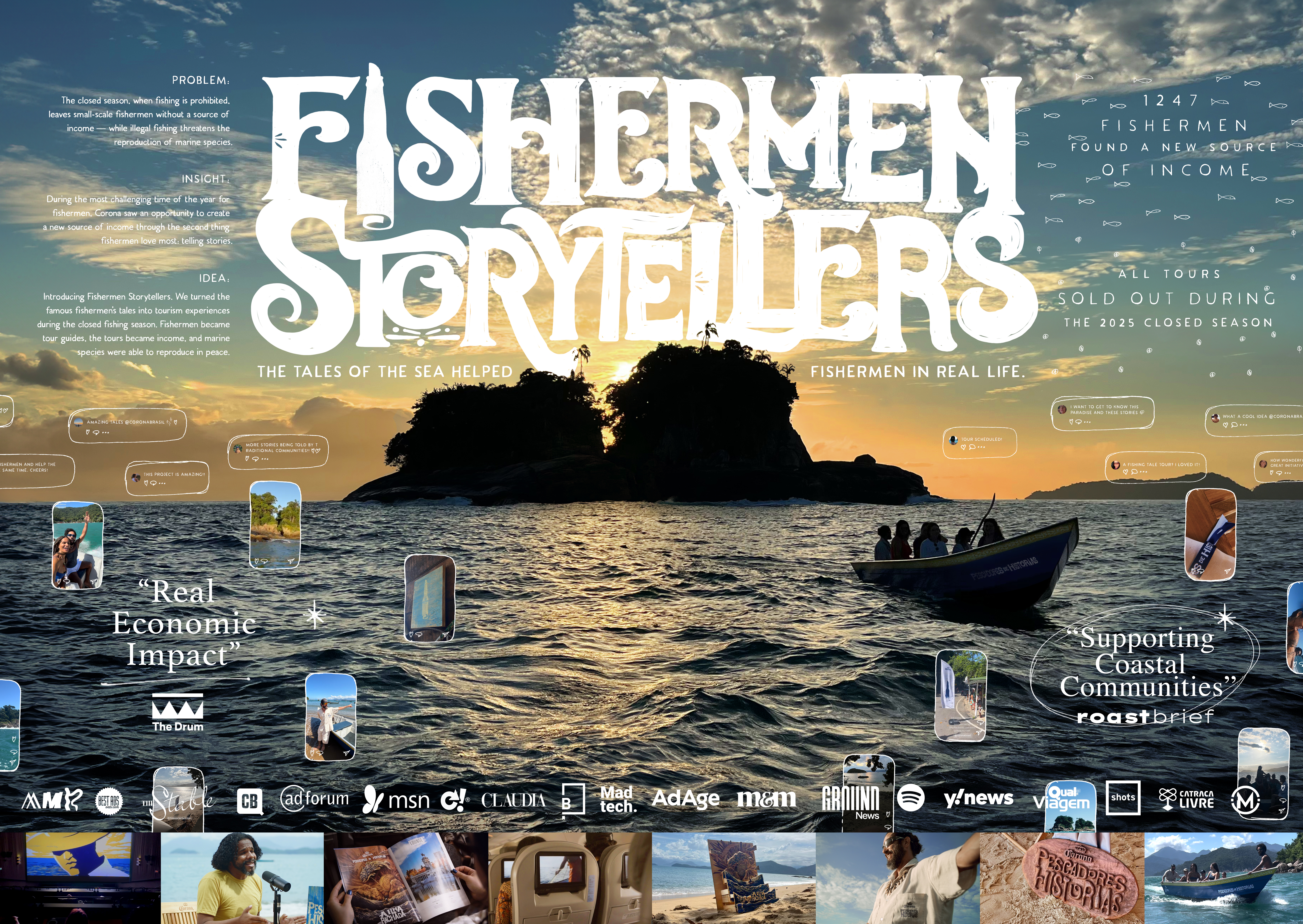 During the closed fishing season, when fishing is prohibited, small-scale fishermen are left without income — and the reproduction of marine species is threatened by illegal fishing. To address both sides of this issue, we grounded our strategy in a powerful cultural insight: fishermen love telling stories. We visited small fishing communities and listened to hundreds of local legends. That’s where creativity made all the difference. We transformed those fishermen’s tales into local tourism experiences. Fishermen became guides, their stories became attractions, and the tours became a new source of income — all while allowing marine life to reproduce safely. The public embraced the initiative across all platforms — from the brand’s film on social media, to the fishermen’s podcast onboard over 18,000 flights, and even in small local hotels. The impact was immediate: all tours sold out in under 24 hours, creating a powerful blend of economy, environment, and entertainment.
