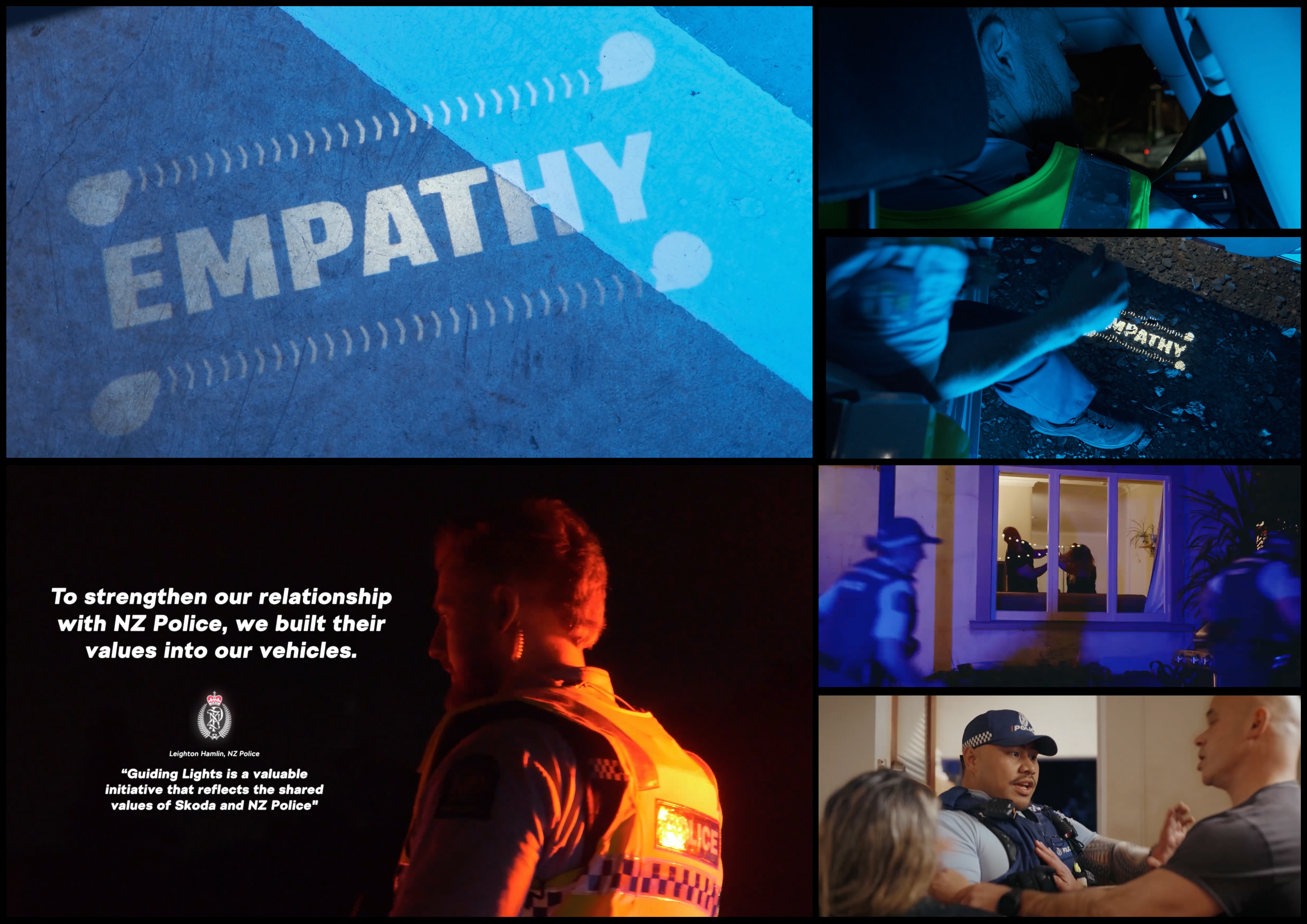 NZ Police are trained in a mindset based on showing empathy in high-intensity situations—times when instincts, emotions and the fight or flight response threaten to cloud their approach. Research consistently shows that repetition strengthens neural pathways, solidifying memories and making actions more automatic through a process called neuroplasticity. This means repeated actions become easier and less reliant on conscious thought. So we harnessed that insight and customised the door ‘puddle lights’ in the NZ Police Skoda Superb cars, to project NZ Police’s core value of empathy onto the ground below. So now, every time an officer steps out of their car and into a high intensity situation, the first thing they see is a Guiding Light, there to help bring their training in empathy to the forefront of their mind.