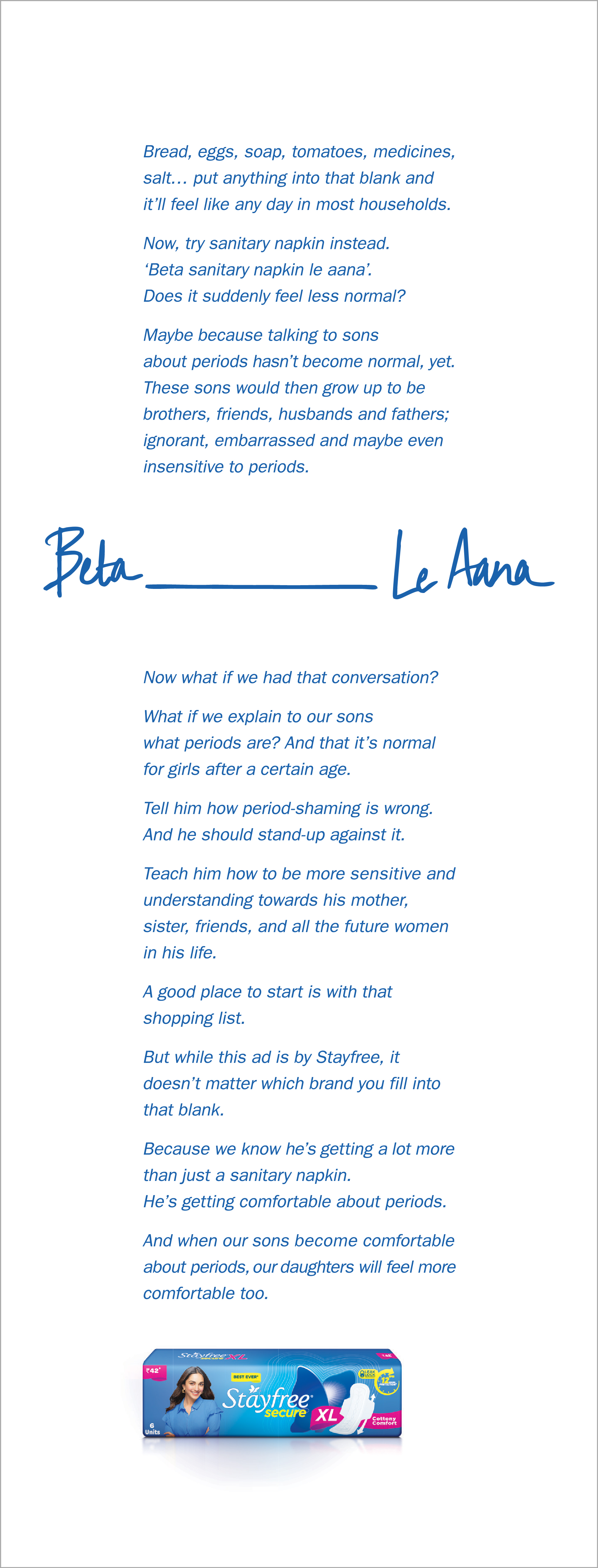 To teach boys about menstruation, Stayfree turned a simple act into a powerful lesson: asking sons to buy sanitary pads. Launched on Daughters’ Day, the “Son, Get Stayfree” campaign urged parents nationwide to hand their boys a pad at the store - an everyday moment that challenged silence and sparked dialogue at home. An open letter to other brands invited the entire industry to join, amplifying the idea beyond Stayfree’s own advertising. Execution covered YouTube and Instagram videos, social-media posts, digital banners, grocery-store posters, hoardings, and playful “Adarsh Balak” book visuals - reaching urban & rural families alike. Each touchpoint was designed to be relatable and respectful, so the message felt natural, not forced. In schools, teachers incorporated the campaign into lessons, reinforcing the home conversation & turning theory into practice. By making the act of purchasing pads part of boys’ everyday lives, the campaign normalized menstrual products and made the topic approachable. The success of the solution lay in its simplicity: one small task, repeated across channels & communities, creating thousands of teachable moments. As other brands and schools adopted the idea, it scaled effortlessly, proving that deep cultural norms can shift through tiny, humanizing actions. Reframing menstruation into a shared responsibility, “Son, Get Stayfree” didn’t just sell a product - it reshaped behaviour, fostered empathy & planted the seeds for lasting menstrual equity.