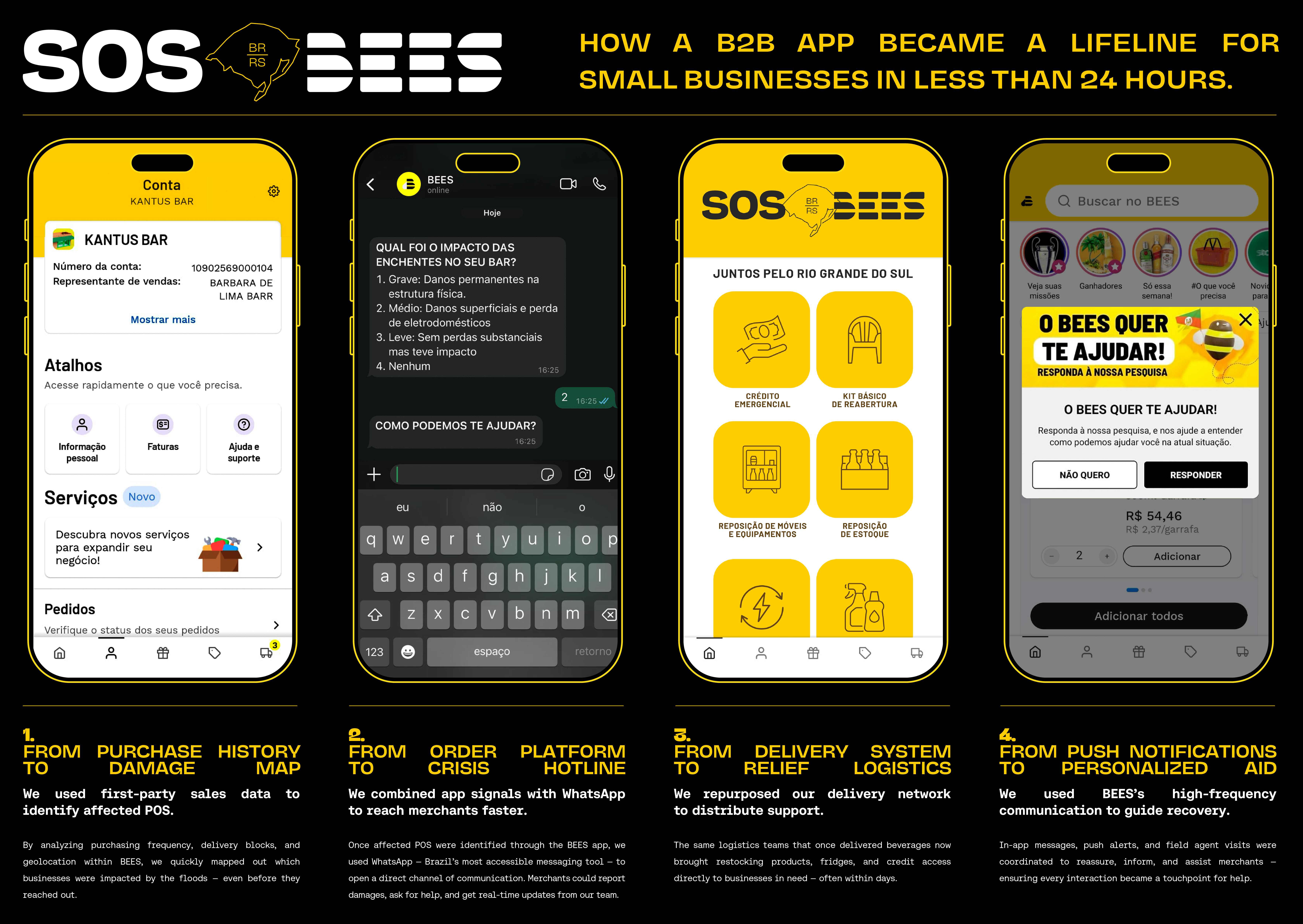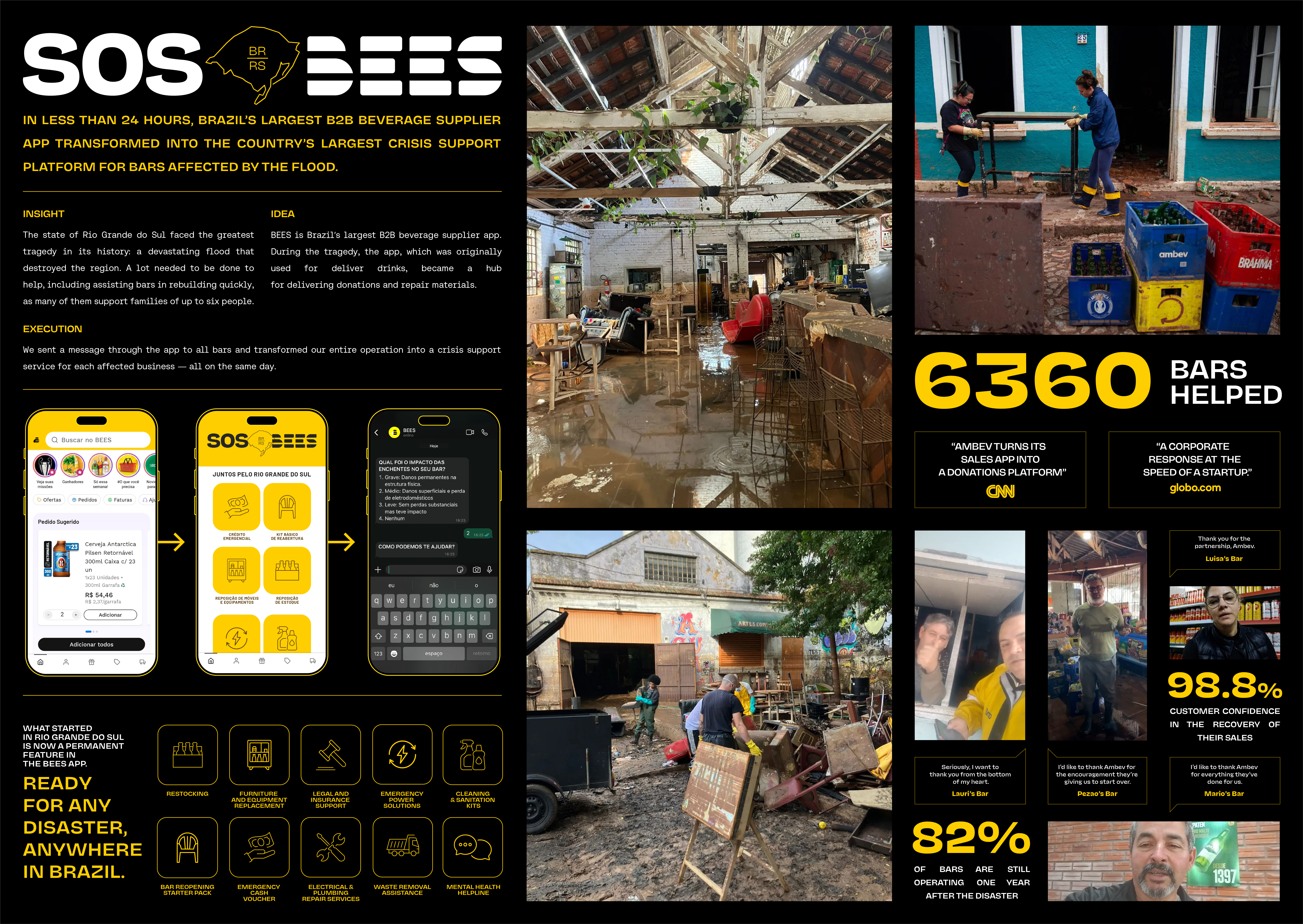BEES is the largest B2B beverage app in Brazil, operated by Ambev, with a solid base of small bars and merchants — many of whom support entire families. In 2024, Rio Grande do Sul faced the worst flood in decades, with cities submerged and thousands of businesses destroyed. In this context, BEES saw the urgency to act, transforming its sales platform into an emergency support network. This move reflected not just a response to the disaster, but a reinterpretation of the brand’s very mission: using the power of logistics to help communities rebuild. This solution was only possible in this market, at this moment, and with this brand — where technology, reach, and purpose came together.