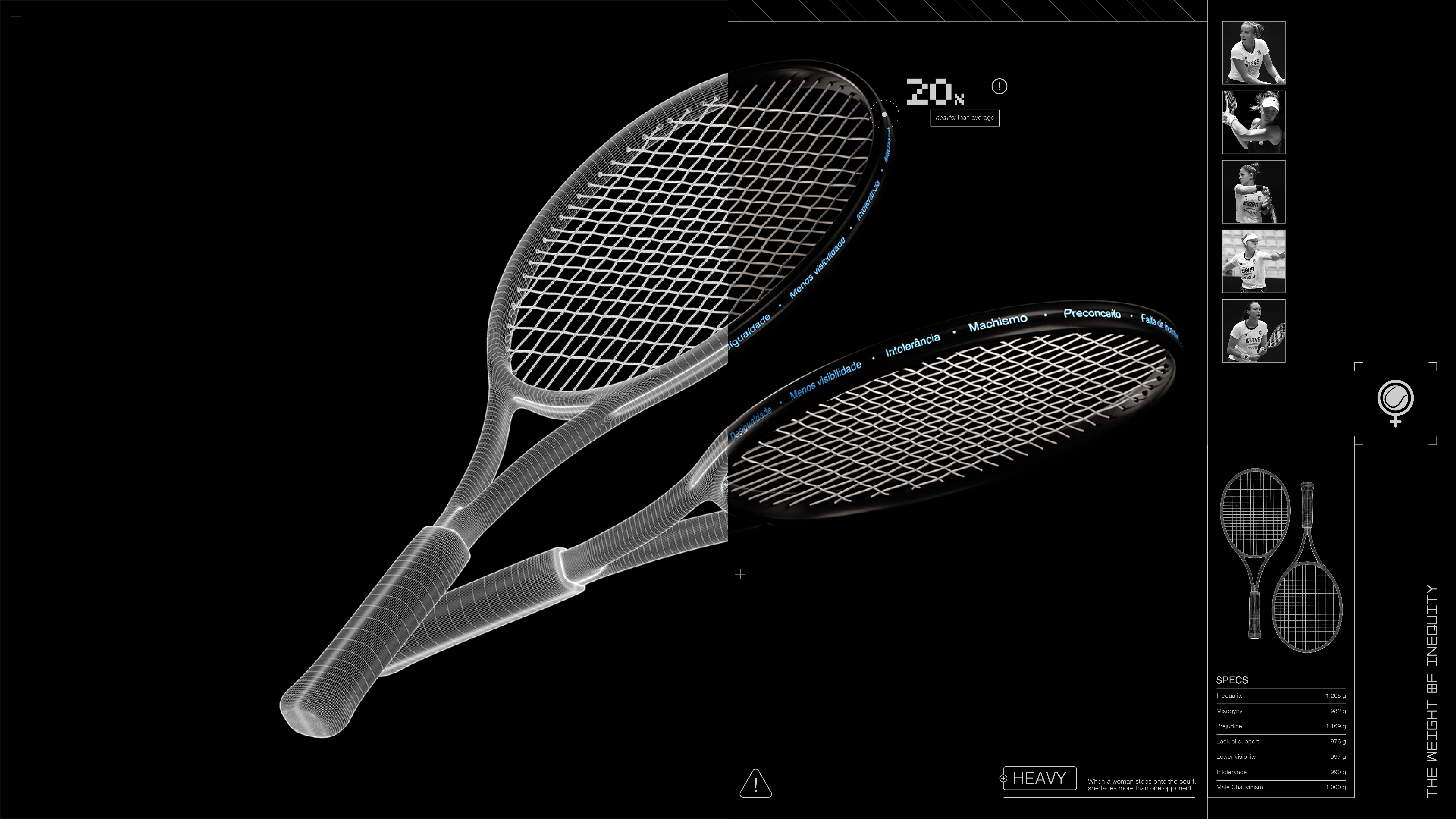 We created a tennis racket 20 times heavier than normal to symbolize the inequities women face in sports. The "heaviest racket in the world" — weighing 6 kg instead of the standard 300 g — was unveiled to the public and the Brazil National Team players during the Billie Jean King Cup tournament. This powerful symbol honored Billie Jean King, a trailblazer for equity in sports, and sparked a national conversation about the weight of inequity. For the first time, a tennis racket became a catalyst for real change.