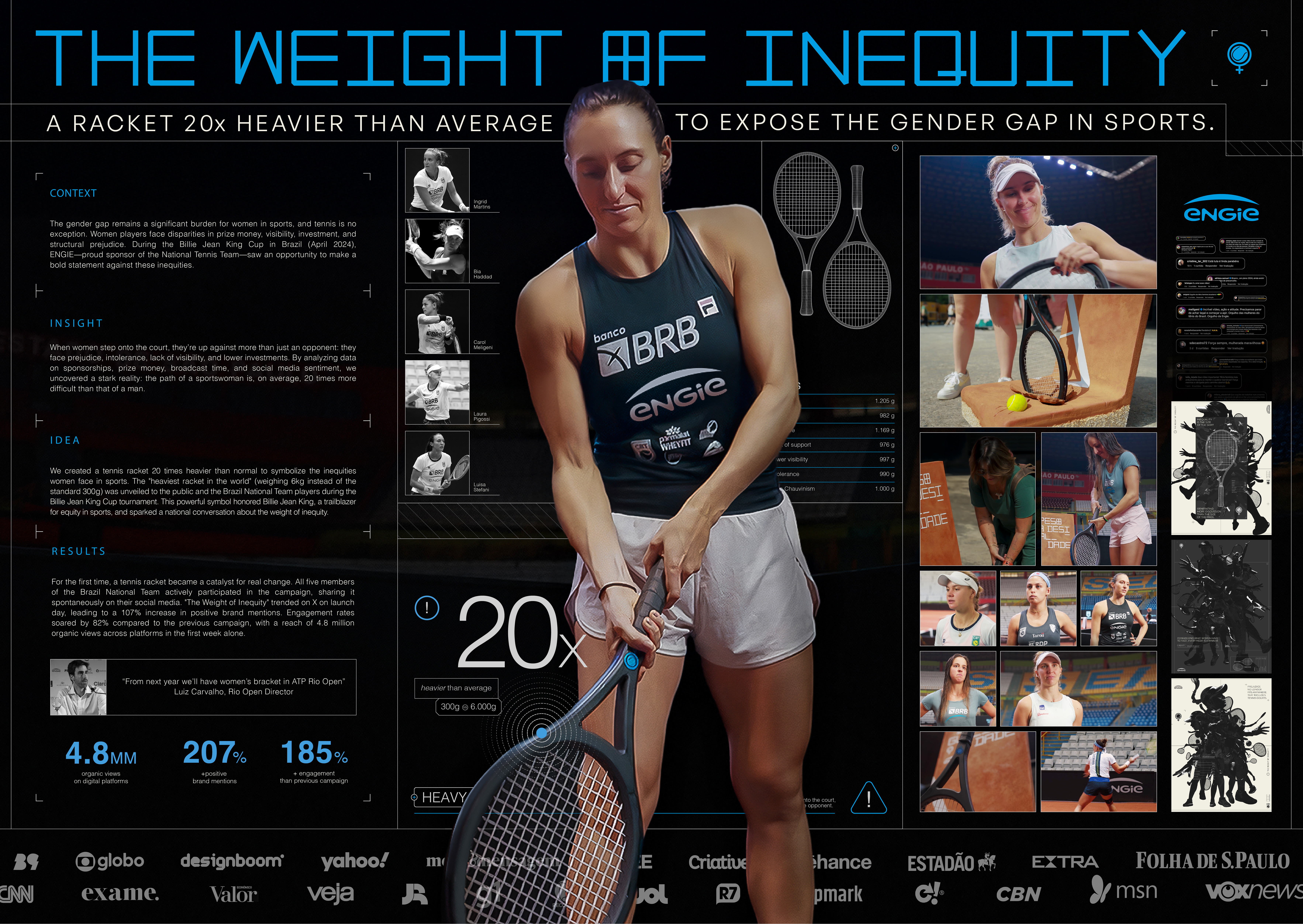 The gender gap remains a significant burden for women in sports, and tennis is no exception. Female players face disparities in prize money, visibility, investment, and structural prejudice. During the Billie Jean King Cup in Brazil (April 2024), ENGIE — proud sponsor of the National Tennis Team — saw an opportunity to make a bold statement against these inequities. When women step onto the court, they’re up against more than just an opponent: they face prejudice, intolerance, lack of visibility, and lower investments. By analyzing data on sponsorships, prize money, broadcast time, and social media sentiment, we uncovered a stark reality: the path of a sportswoman is, on average, 20 times more difficult than that of a man.