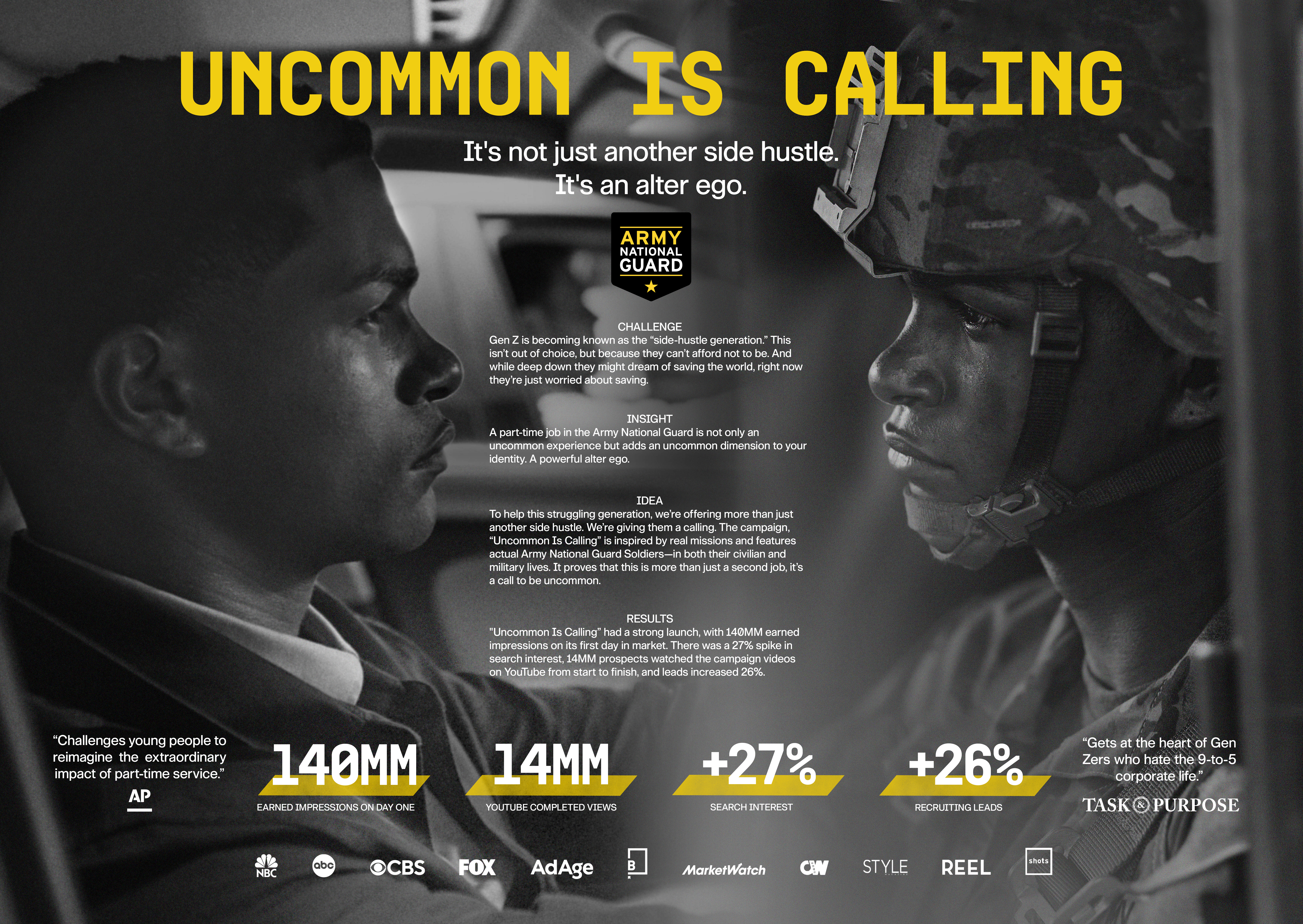 Due to a general lack of awareness—and very little trust in or preference towards—the Army National Guard brand, we needed a new campaign to differentiate this organization from other Army ways to serve. Because of this lack of awareness, we would need both a powerful idea and a distinctive execution that captured Gen Z’s attention and imagination, breaking through the military recruitment “sea of sameness.”
