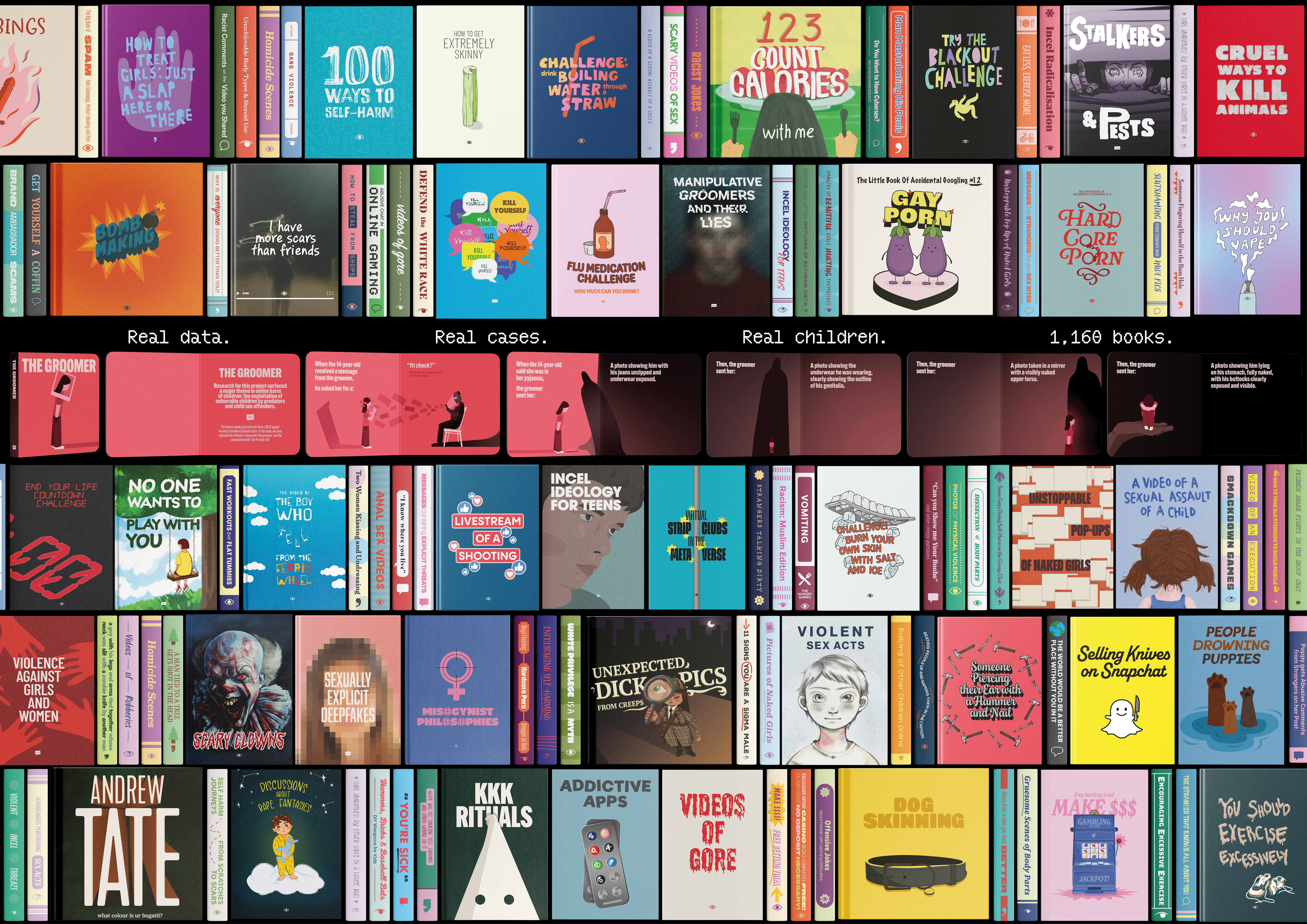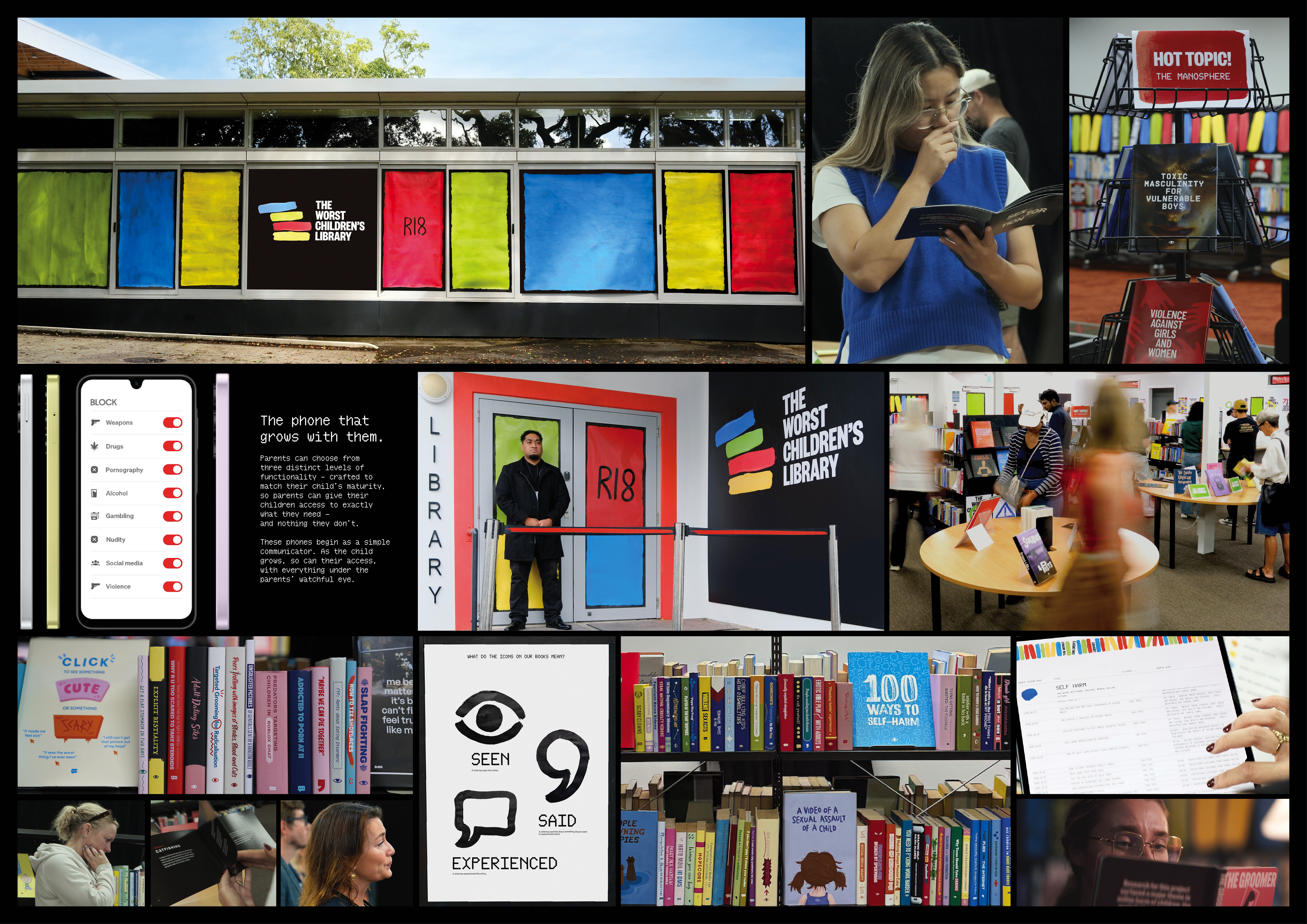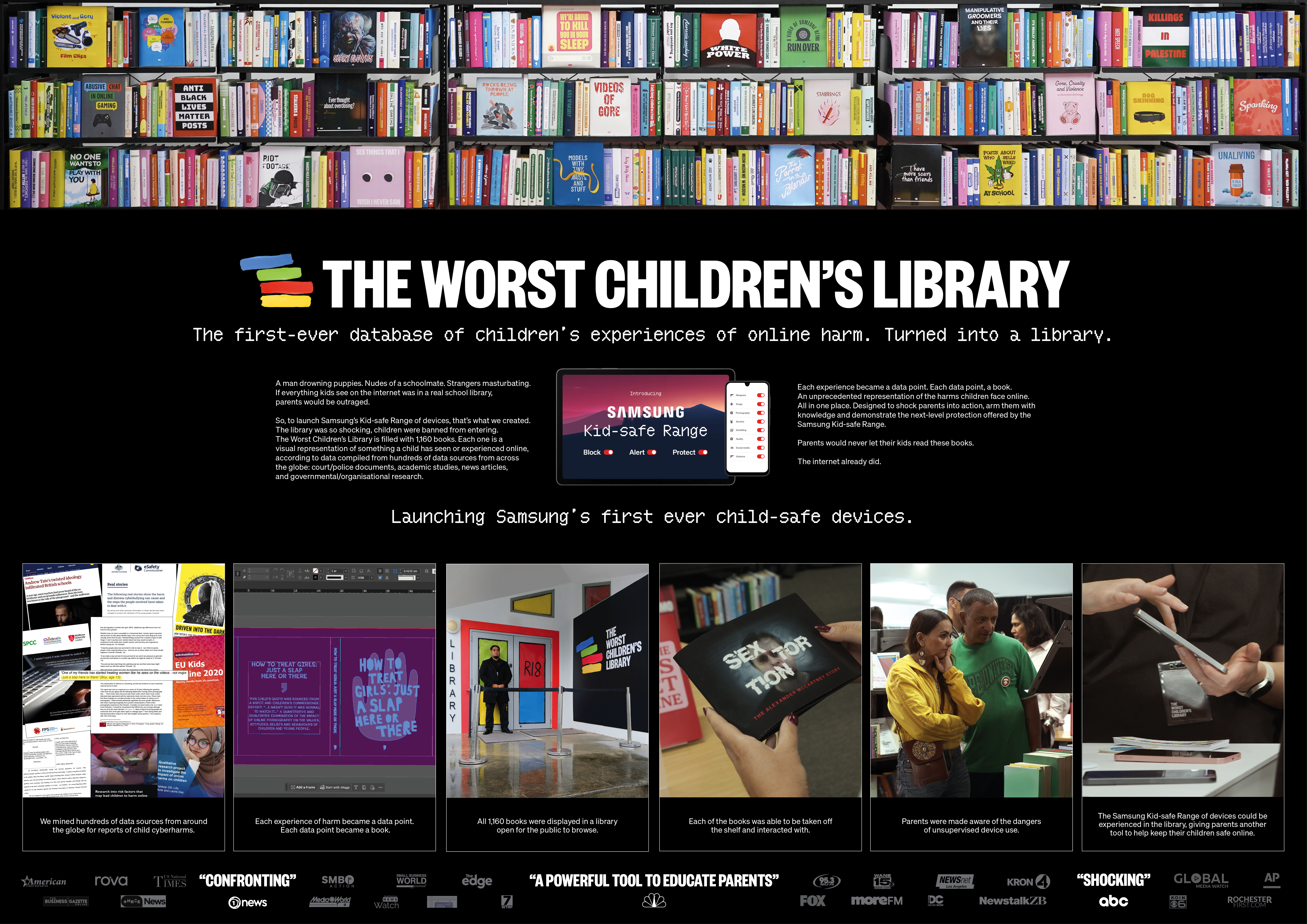 brief: launch Samsung's first child-safe range target: New Zealand parents media budget: zero solution: a school library filled with books that no parent would let their children see. But the internet already did. We searched hundreds of sources to find the worst things children have seen and experienced online, and created over a thousand books, filling a school library - the place children used to go for information. An unprecedented representation of the harm children experience online, designed to shock parents into changing their behaviour. A live product demonstration - to showed parents how the Samsung devices filter the internet, we used projection mapping to make the harmful books disappear. The campaign smashed our objective to achieve awareness - the experience was covered by all major New Zealand news outlets, along with 193 international publications. The Kid-safe Series, following this successful New Zealand launch, is now being rolled out globally.